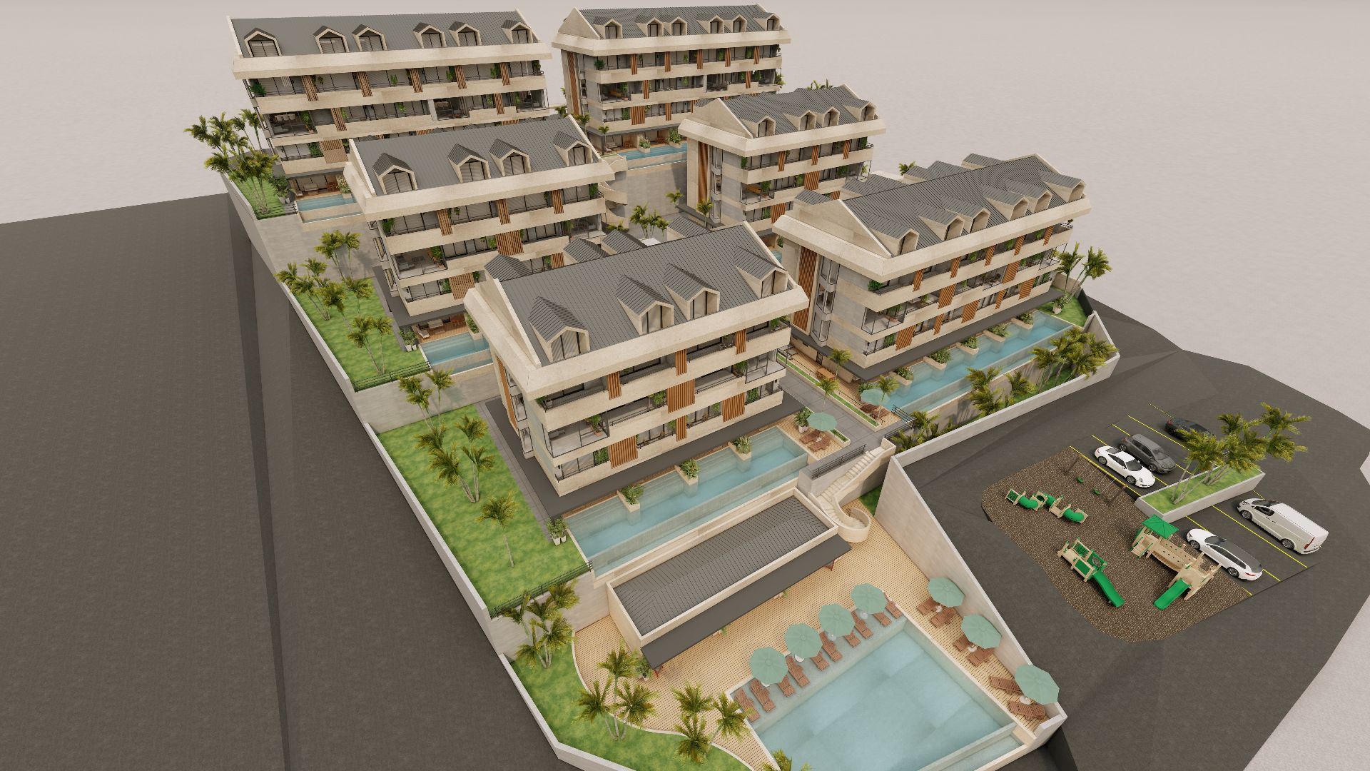 Swim up dubleksler teraslı ve müstakil girişli olup, bazı ünitelerin müstakil bahçeleri de bulunmaktadır. Her bloğun altında bulunan kapalı otopark ve asansörler ile dairelere direkt ulaşım imkânı vardır.