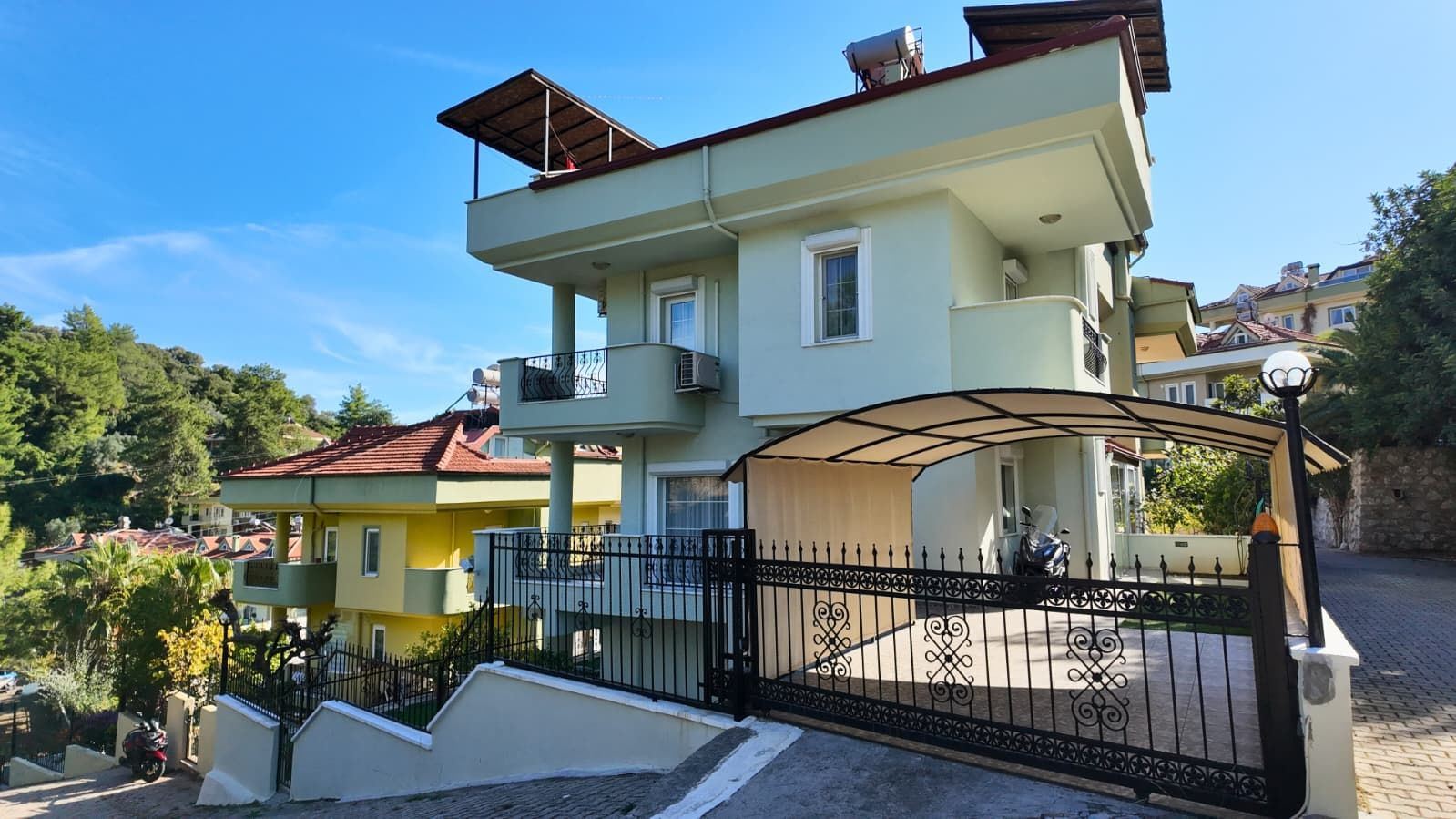 Located in Beldibi Neighborhood, Marmaris, this well-maintained and move-in-ready four-level villa (forleks type) offers a comfortable lifestyle with its spacious three-story layout, large garden, enclosed garage, and a fireplace that efficiently heats all three floors.